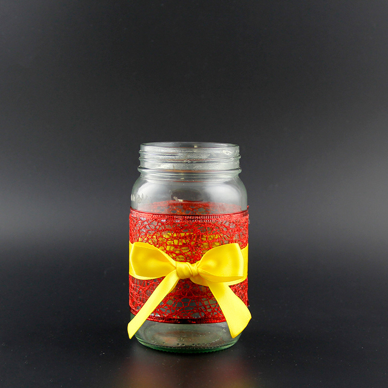 1.把宽的丝带绕着瓶子围一圈,用胶水固定;