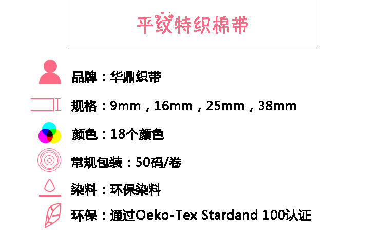 棉带按其纹路来分类,可分为:平纹、珠纹、人字等。棉带具有吸湿性强,缩水率较大的特点,可应用与服饰、发饰、包装等行业。